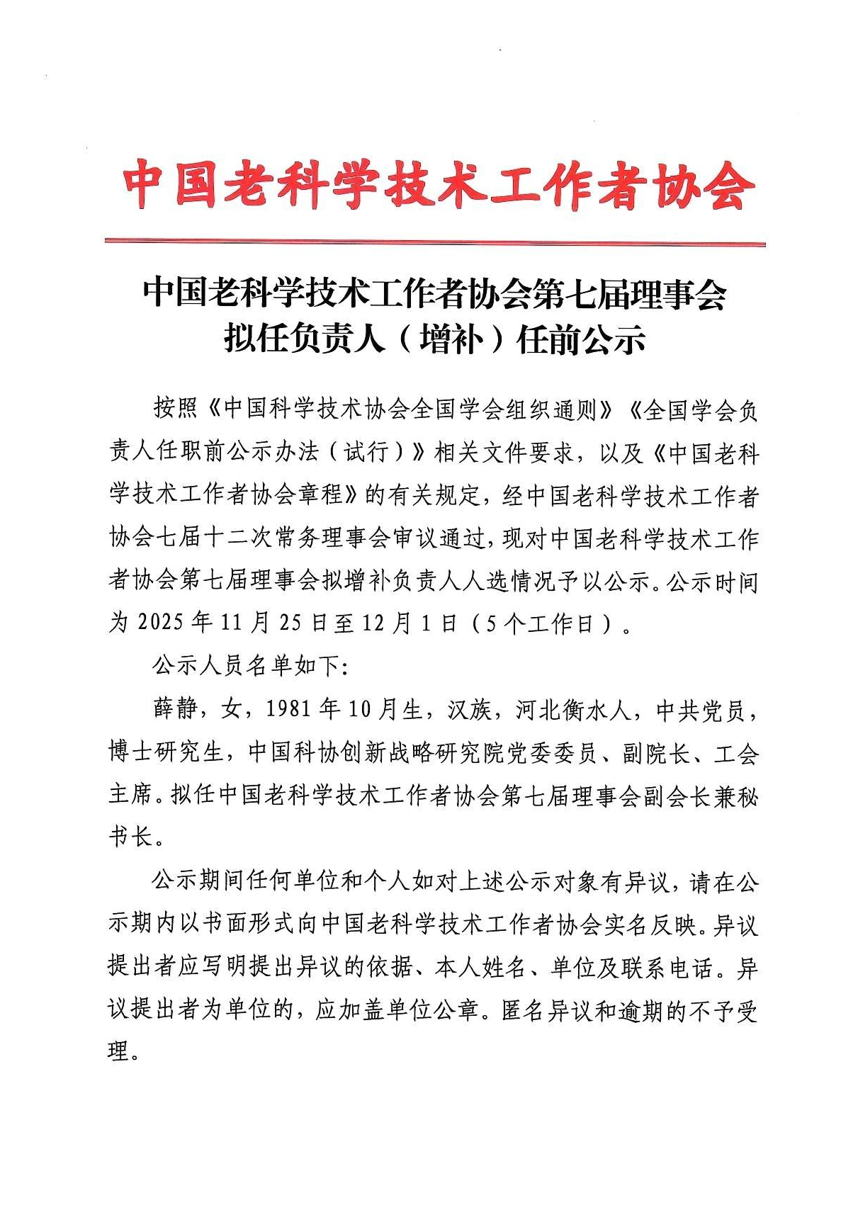 中国老科学技术工作者协会第七届理事会拟任负责人(增补)任前公示