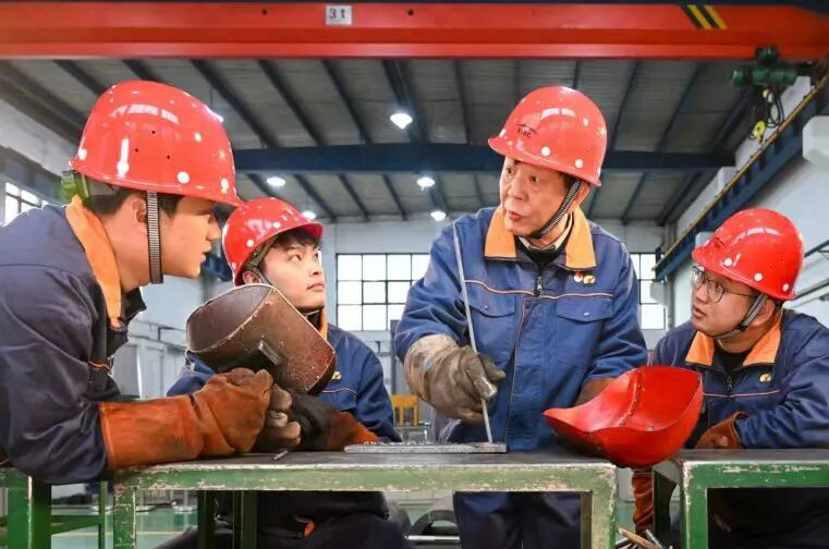 艾爱国在湘钢焊接试验室与徒弟们探讨钢材新产品焊接方法及操作要领