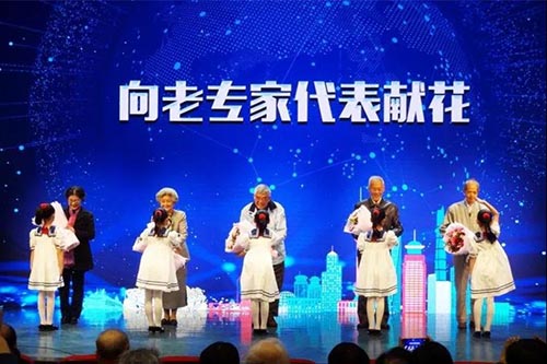 启动仪式上,青少年向参与科普宣讲活动的老专家代表们献花。市科协、市老科协、虹口区委、区教育局等单位的领导向青少年代表赠送科普读物。