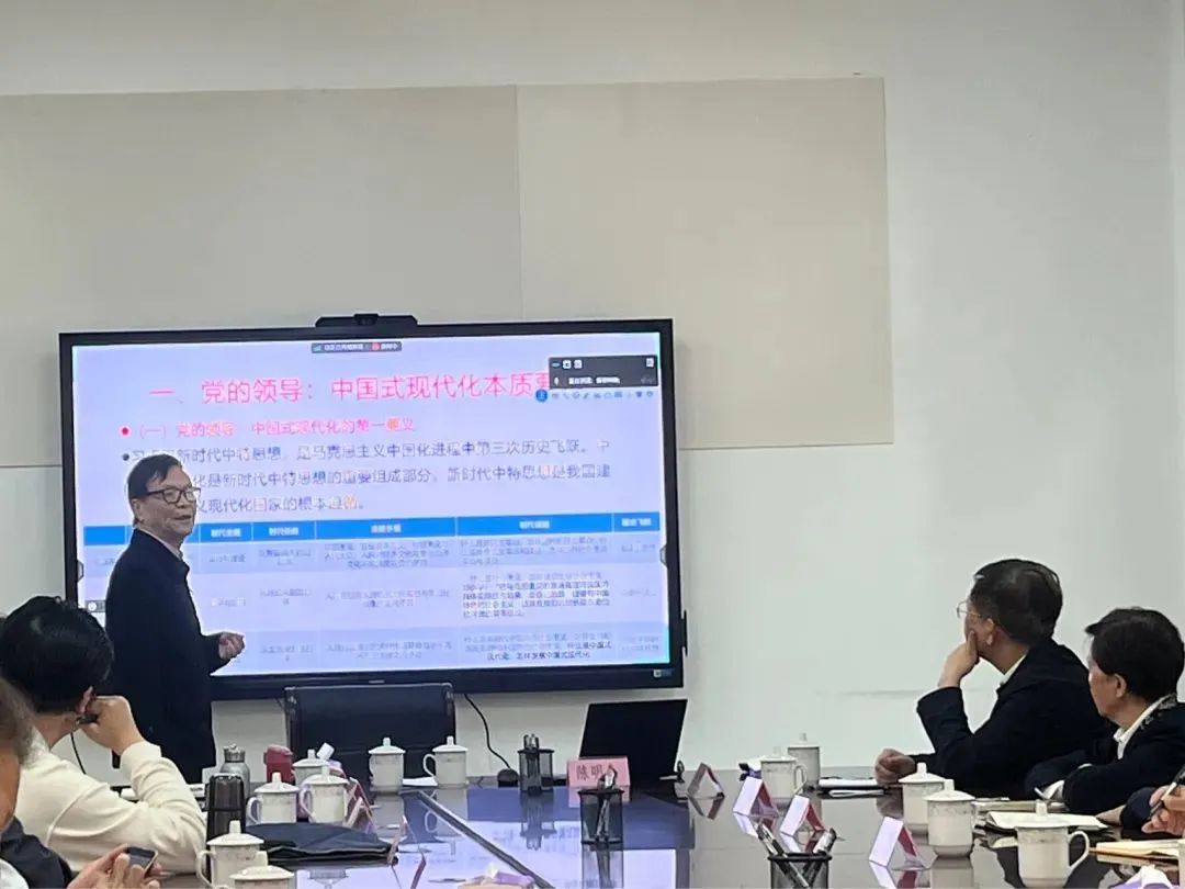 为深入学习贯彻党的二十大精神,落实今年协会工作部署,4月28日,由福建省老科协主办的福建老年科技大学首期课程在省老科协一楼会议室开讲,并通过线上同步向省市县老科协、广大科技工作者直播。本期课程邀请福建省委党校产业与企业发展研究院院长陈明森教授作《中国式现代化:本质属性、中国特色和首要任务——党的二十大精神解读》专题讲座。省老科协常务副会长杨江帆、以及在榕副会长、秘书处、办公室等成员,省直分会、专委会代表出席线下课程。课程讲座由副会长林峰主持。