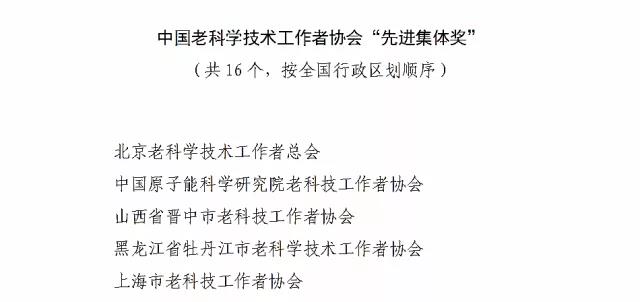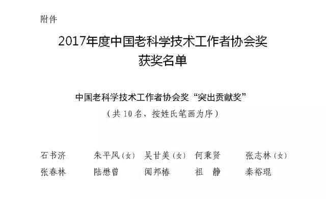 经民主推荐、组织评选、社会公示,中国老科协六届四次常务理事会审议,决定授予于永芳等176名同志2017年度中国老科学技术工作者协会奖,对其中石书济等10名同志授予中国老科学技术工作者协会奖“突出贡献奖”;授予北京老科学技术工作者总会等16个组织2017年度中国老科学技术工作者协会奖“先进集体奖”。