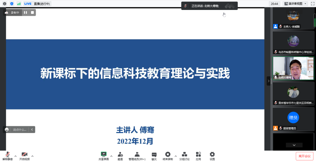 为贯彻党的二十大精神,落实《关于新时代进一步加强科学技术普及工作的意见》,推进《现代科技馆体系发展“十四五”规划(2021-2025年)》重点任务,2022年12月5-9日,由中国科技馆发展基金会、中国老科学技术工作者协会主办,中国科学技术馆、湖南省科学技术协会、湖南省老科学技术工作者协会、中国教育发展基金会支持承办的为期5天的2022年度农村中学科技馆项目工作研讨及培训交流会线上举办。中国老科协常务副会长,中国科协原党组副书记、副主席,中国科技馆发展基金会顾问齐让出席开班仪式并致辞。中国科协党组成员、书记处书记、中国科技馆馆长、中国科技馆发展基金会副理事长殷皓出席结业仪式并总结发言。来自全国28个省、自治区、直辖市和新疆生产建设兵团的农村中学科技馆教师和各地区科协、科技馆项目负责人以及老科协代表共计850余人参加会议。